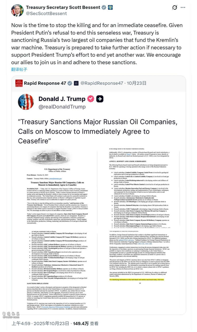 美国直接制裁了俄罗斯最大的两家石油公司俄罗斯石油公司(Rosneft)和卢克石油公司(Lukoil)及其几十家子公司。