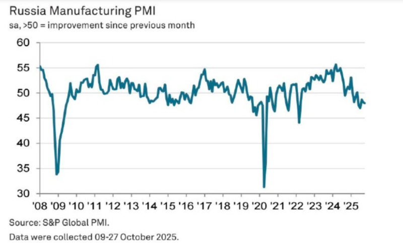俄罗斯的商业信心也一直在减弱。标准普尔全球俄罗斯综合采购经理人指数从8月份的49.1降至9月份的46.6,标志着私营部门连续第四个月收缩,也是自2022年10月以来的最低水平。10月份俄罗斯制造业采购经理人指数继续较9月的48.2点下滑至48点。这一数据表明,俄罗斯制造业活动出现自今年7月以来的最大幅度滑坡,经营状况已连续五个月下降。
