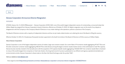 无独有偶,10月13日,另一家希腊船运巨头 Danaos Corp(达那俄斯)也宣布,美国籍独立董事 William Repko已经和公司董事会“和平分手”。总部位于香港的太平洋航运(Pacific Basin),也在15日宣布重组董事会。