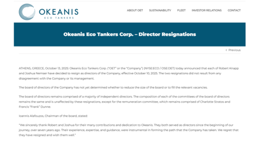 10月10日,在(挪威)奥斯陆和美国上市的希腊航运公司Okeanis Eco Tankers(OET)率先发布公告,表示该公司的两名美国籍董事已经“主动辞职”。