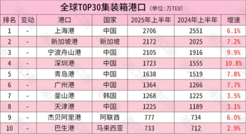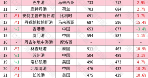 根据Container Trade Statistics(CTS)9月更新的统计数据,全球排名前30的集装箱港口中,中国占了11个。而其中,上海港、宁波舟山港、深圳港、青岛港、广州港、天津港,占据全球前10的6席。相比之下,美国在这份榜单中,只拿走了3个位置,而且都在后半。