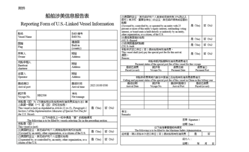 英国的《劳氏日报》披露了一份中国新规落地之后,各大船舶航运公司收到的“涉美信息报告表”。这份表格,在10月14日中方更新公告的当天,立刻就被更新到各大中国运营的港口。也是在同一天,中国就从美国美森航运公司的集装箱货轮上,收取到了第一笔446万的港务费。