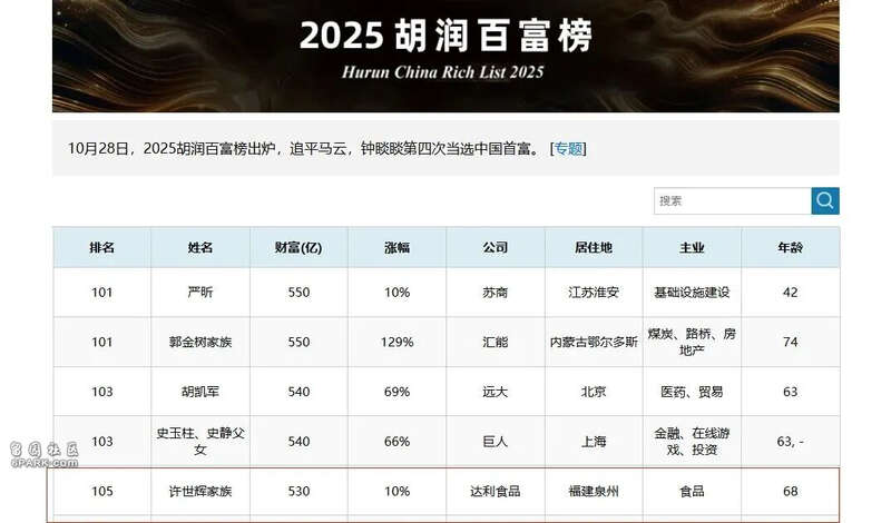 在福布斯“2018年全球亿万富豪榜”中,许世辉家族甚至超越娃哈哈宗庆后家族,成为中国食品业首富。据2025胡润榜,许世辉家族财富,高达530亿元,其中,许阳阳与母亲陈丽玲,身家为260亿元,是福建女首富。