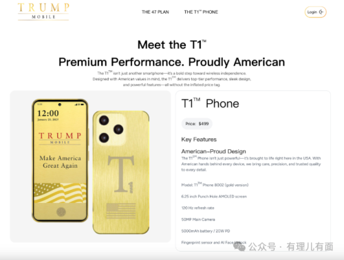 之前有理哥介绍过,今年6月特朗普集团高调进军手机市场,推出一款售价499美元(将近3600元人民币)的智能手机,宣称这款手机由“美国制造”。特朗普的二儿子埃里克还对外宣称,这款手机和移动服务旨在呼应特朗普“振兴美国制造”“提高美国就业”的政策方向。