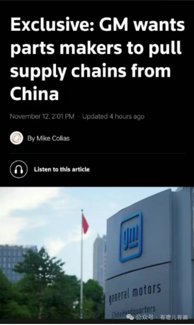 据报道,美国最大的汽车制造商通用汽车已命令数千家供应商从其供应链中剔除中国零部件,一些供应商已将2027年设定为减少对中国依赖的最后期限。