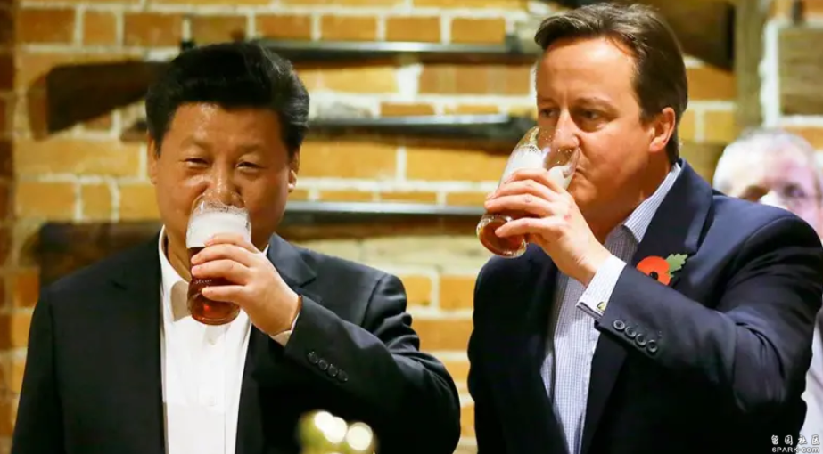 图像加注文字,2015年,习近平访英期间,时任首相卡梅伦与他在一家酒馆畅饮啤酒。