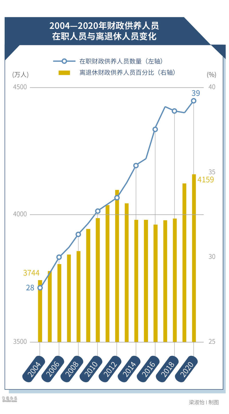 2020年,供养人员中近四成并非在职人员,离退休人数已从2004年的1468万人增长到2687万人。