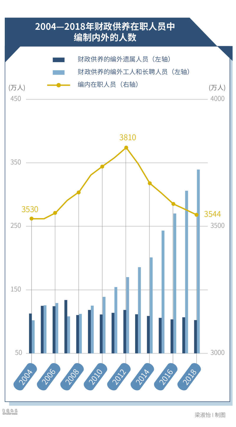 2004年,中国有215万编外的在职财政供养人员,2018年上升到442万,增幅超过一倍。尤其是在2008年和2013年两次政府机构改革后,增速明显加快。
