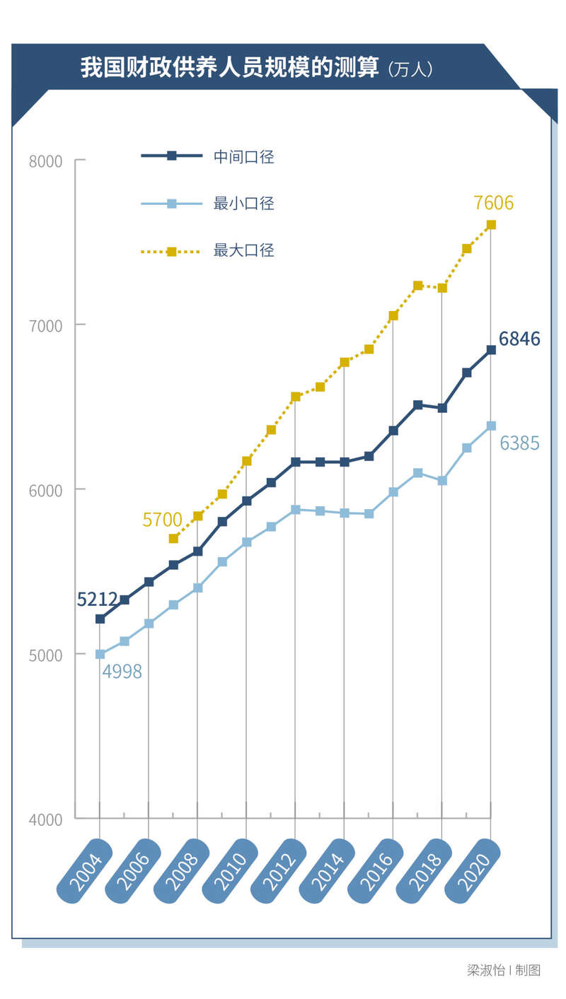 2004-2020年,以中间口径度量,中国财政供养人员从5212万人增加到6846万人。尽管2013年政府机构改革后,财政供养人员增速有所放缓,但就“供养人员只减不增”的目标而言,其上升趋势并未被彻底抑制。
