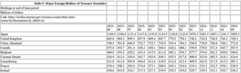 中国作为第三大美债持有者,9月持仓小幅减少5亿美元,降至7005亿美元。自2022年4月起,中国持有的美债规模始终维持在1万亿美元以下。市场分析普遍认为,在中美关系演变及外汇储备资产多元化趋势下,中国对美债的持仓可能继续保持稳步下降态势。