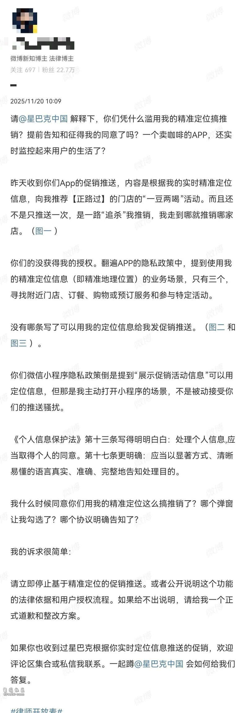 该博主要求星巴克立即停止基于精准定位的促销推送,或公开说明该功能的法律依据和用户授权流程。如果星巴克无法给出合理解释,用户要求得到一个正式道歉和整改方案。