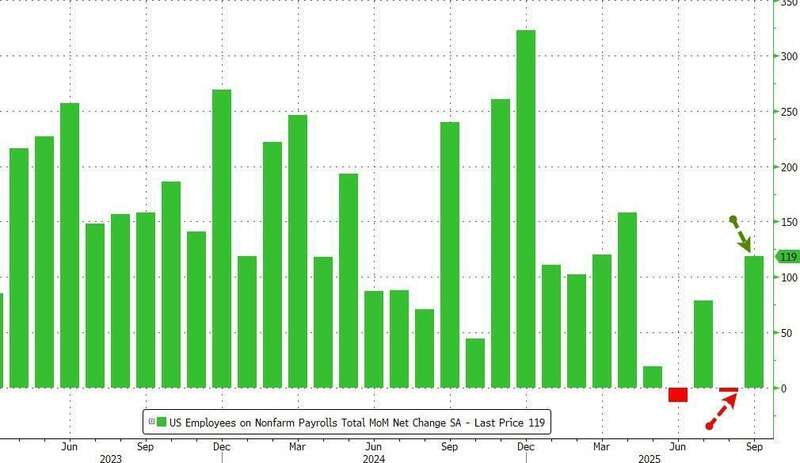 美东时间周四,美国劳工统计局公布的数据显示,美国9月非农就业意外大增11.9万人,显著高于市场预期的5万人。报告发布后,美国股指期货涨幅扩大,美国国债收益率全线走低,交易员继续押注美联储不会在12月的会议上进一步降息。