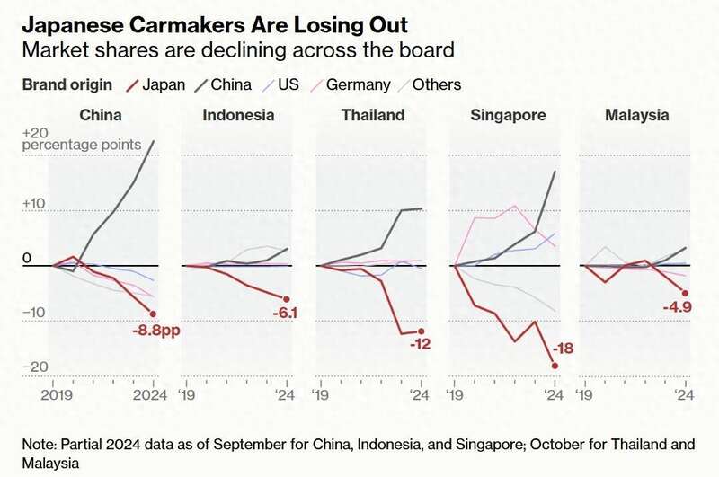 根据彭博社分析,从2019—2024年,日本汽车厂商在中国、新加坡、泰国、马来西亚和印尼损失的市场份额是全球所有汽车厂商之最。在马来西亚的销量下降了5%,在印度尼西亚下降了6%,在泰国下降了12%,在新加坡更是暴跌了18%。