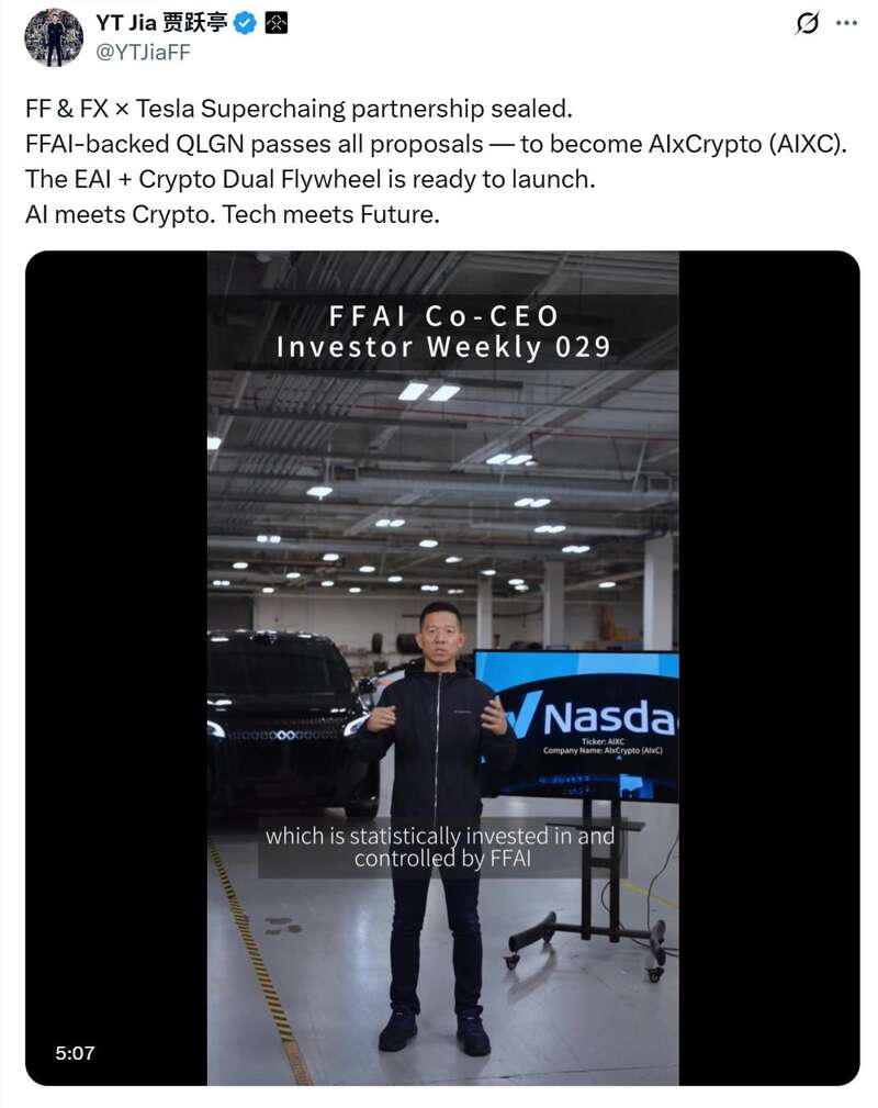 Faraday 发布新闻稿称已完成“FFAI + AIXC 双飞轮、双桥、双上市”体制的形成,且 AIxCrypto 被表述为“其控股的加密公司/子公司”。