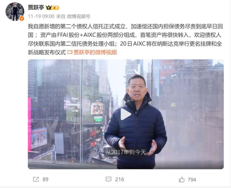 贾跃亭最近又有很多大动作,11月19日,他在微博上的视频中说道,从2017年开始,在美国已经3000多个日日夜夜,无时不刻不想着尽快还债回家。