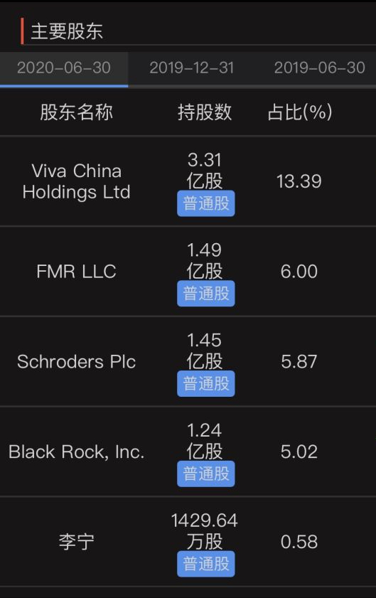 来看看李宁公司的主要股东以及普通发行股的占比。