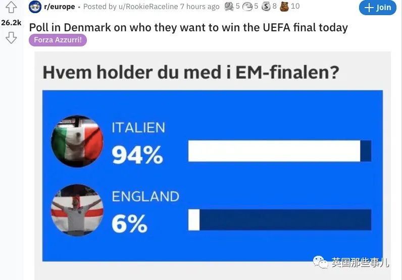 丹麦投票,今晚希望谁赢,94%的人选了意大利。