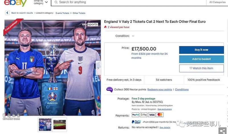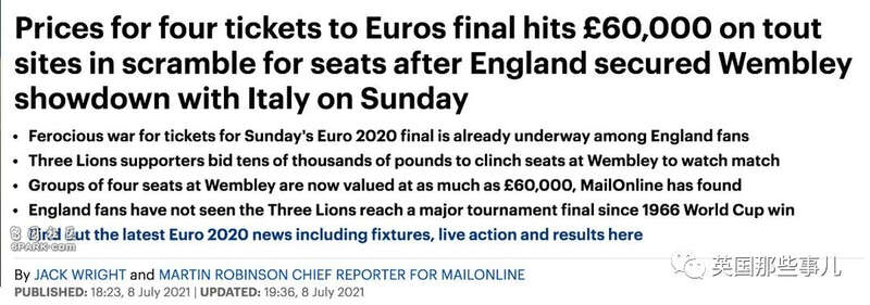 在半决赛英格兰赢了丹麦之后,英国球迷们就疯狂的涌进买票网站,想在自家门口看这场决赛。虽然温布利体育场为决赛开放了6.7万个座位,但是门票早已售罄,二手网站上, 原价几百英镑的票,已经被炒到了5000到数万英镑的价格。