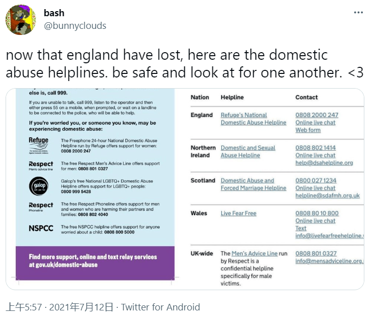 “现在英格兰输了,这是所有全国家暴求助热线。请保护好自己,以及帮助有需要的人。”