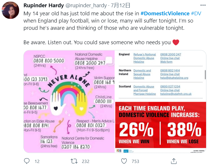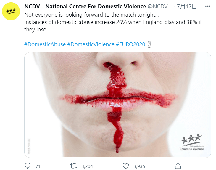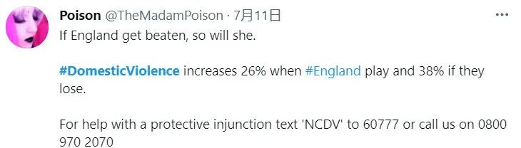 在决赛当天,英国家庭暴力全国中心(NCDV)在推特上发文表示:“并不是每一个英国人都在期盼今晚的比赛….