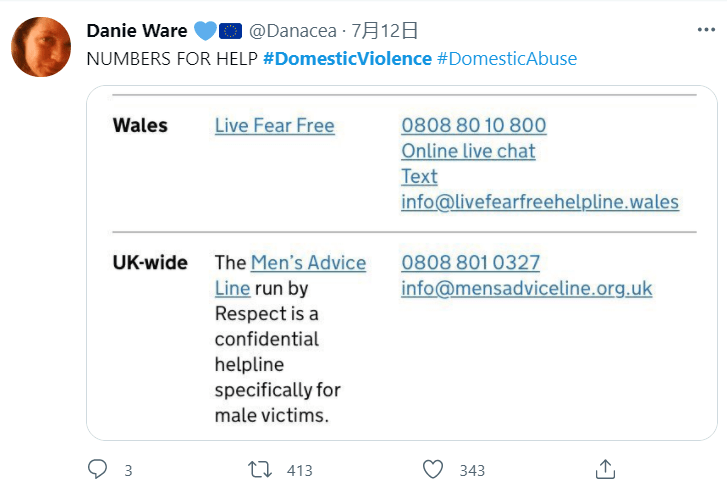 然而正当大家都在开着各种玩笑的时候,突然社交媒体上却出现了很多转发英国各地的家庭暴力求助热线号码的推文。