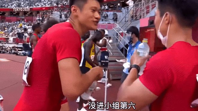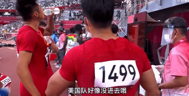 赛后苏炳添不忘关心美国,他在场边问正在喝水的谢震业:“美国队好像没进去哦?”谢震业停止喝水说:“没进,小组第6。”