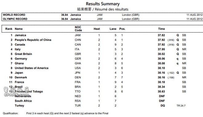 而美国队这样的成绩,主要是交接棒失误,位于第三道的美国队,克利与贝克的交接有着明显的降速。