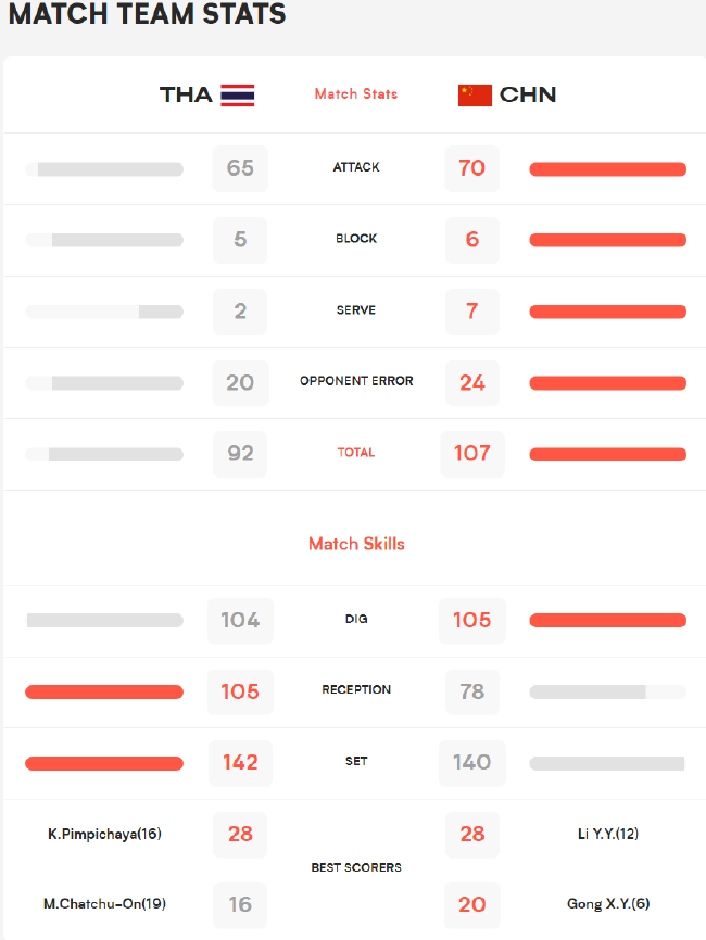 中国女排2-3泰国技术统计 李盈莹28分龚翔宇20分