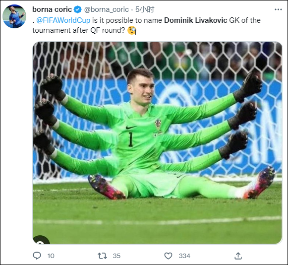 克罗地亚网球运动员波尔纳·丘里奇晒出利瓦科维奇“六臂”表情包,向FIFA喊话:“FIFA是不是可以在1/4决赛后把利瓦科维奇评为本届世界杯最佳守门员。”