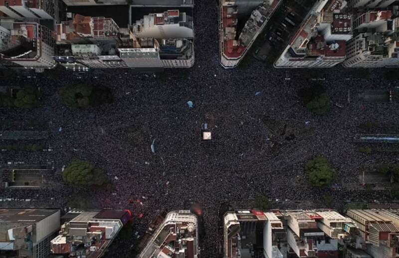 然而这还只是整个布宜诺斯艾利斯市中心位置近两天的一个“缩影”,稍微再放大一些看看,会发现当地地标建筑方尖碑周围百米都被挤了个水泄不通!