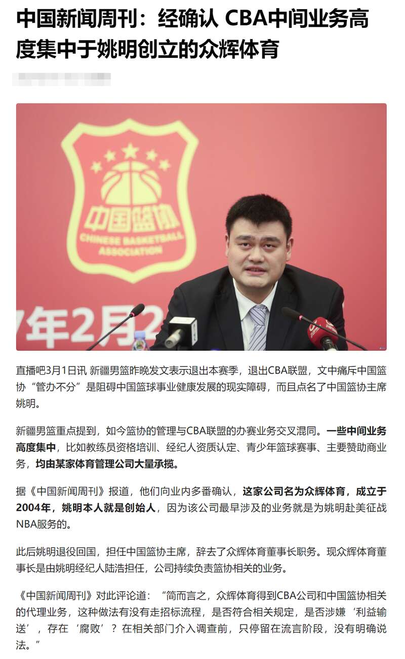 一时之间很多球迷意外的同时,实际上也非常的好奇,新疆男篮在他们的公告中所提到的姚明开设公司,和篮协业务来往的做法到底是不是真的?因为从新疆男篮宣布的消息来看,他们指出目前CBA包括篮协的很多业务都被业内一家公司独揽大权。虽然这个公司他们并没有明确指出,但目前来看媒体人包括官方媒体已经明确指出,所谓独揽大权的公司恰恰就是姚明旗下的众辉体育。
