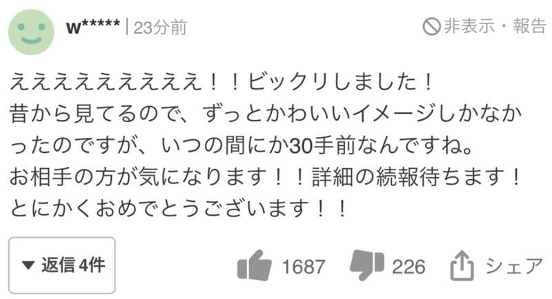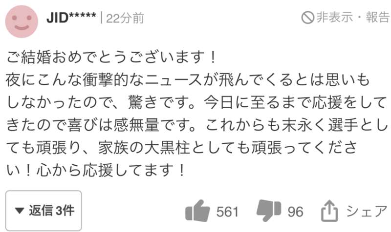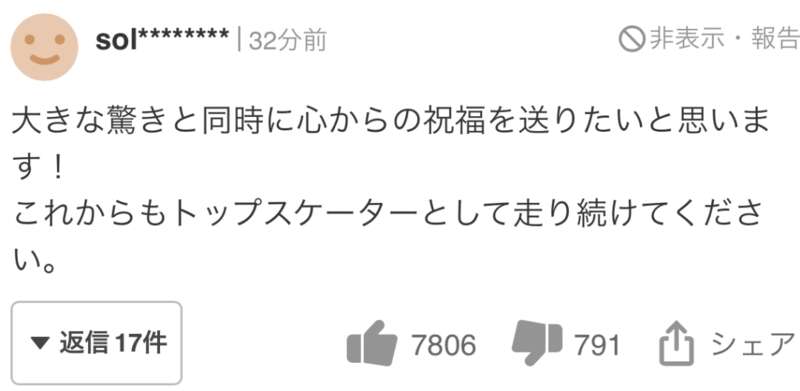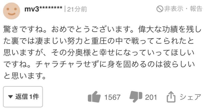 没想到晚上会突来如此冲击性的新闻,大吃一惊。支持他到今天,所以喜悦,感慨无量。今后,作为选手也好,作为家庭顶梁柱也好,请永远加油!衷心支持!