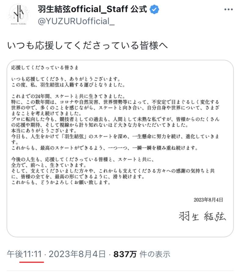 当地时间8月4日晚上11点11分,日本著名花滑选手羽生结弦通过其官方社交账号官宣结婚。
