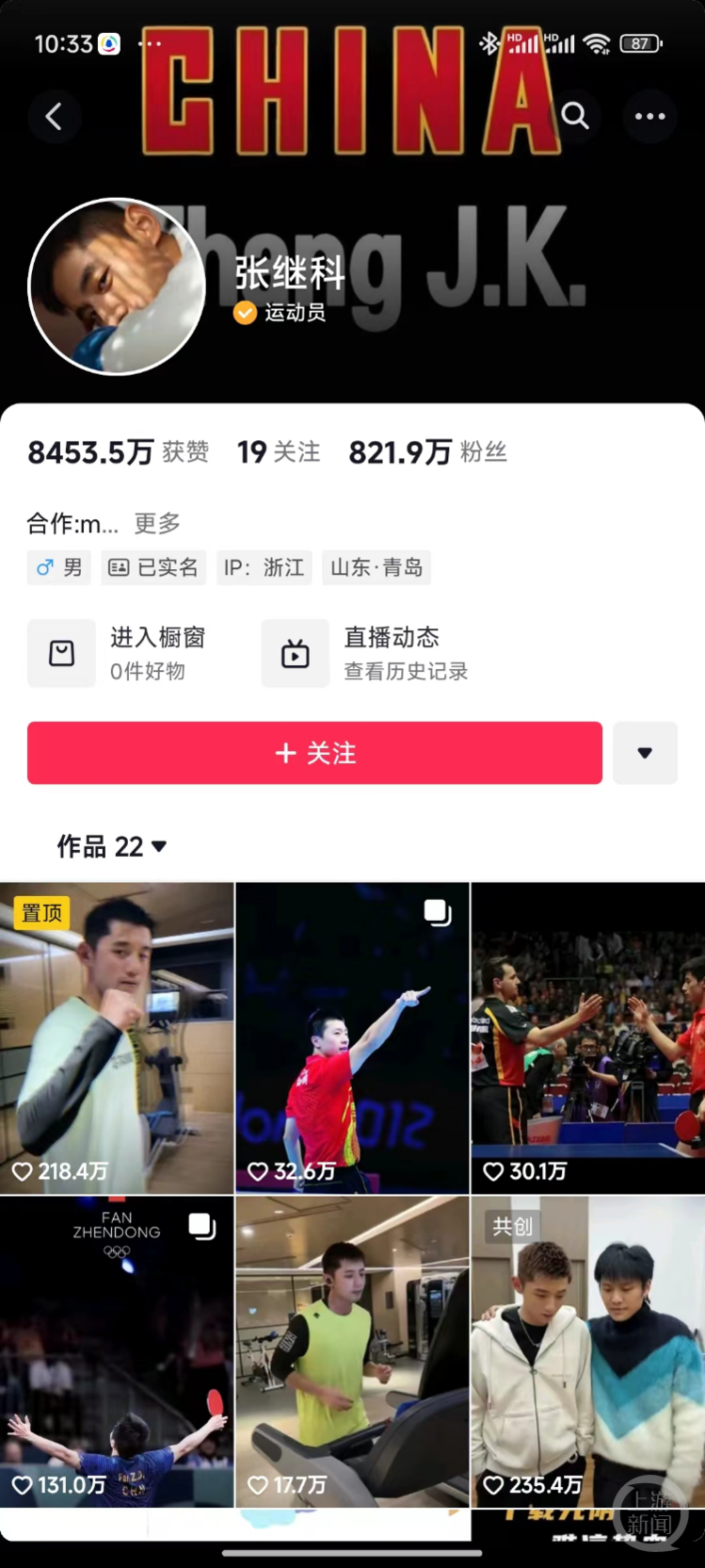 张继科此前的短视频个人账号目前有800多万粉丝,2023年2月后曾长时间断更,今年8月开始恢复更新,目前发出了三个作品。截至发稿时止,“张指导乒乓巨星扬”的账号已有87.5万粉丝。此外,张继科还有账号“张继科工作室”,该账号有18.6万粉丝。
