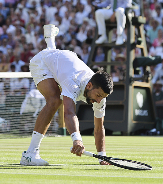 四分之一决赛战胜科博利的倒数第三个球,德约科维奇在底线后方那片褐黄相间的草地与泥土上重重滑倒。倒下的瞬间,他的双腿像被折断的叉骨般分开。尽管他此后取消了周四的训练,却还是踏上了中央球场,面对世界第一,他寄望于物理治疗与止痛药物能再续奇迹。
