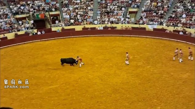 公牛猛烈冲撞,将他抛向半空,然后如山般的身体猛地将他撞向场边石墙。