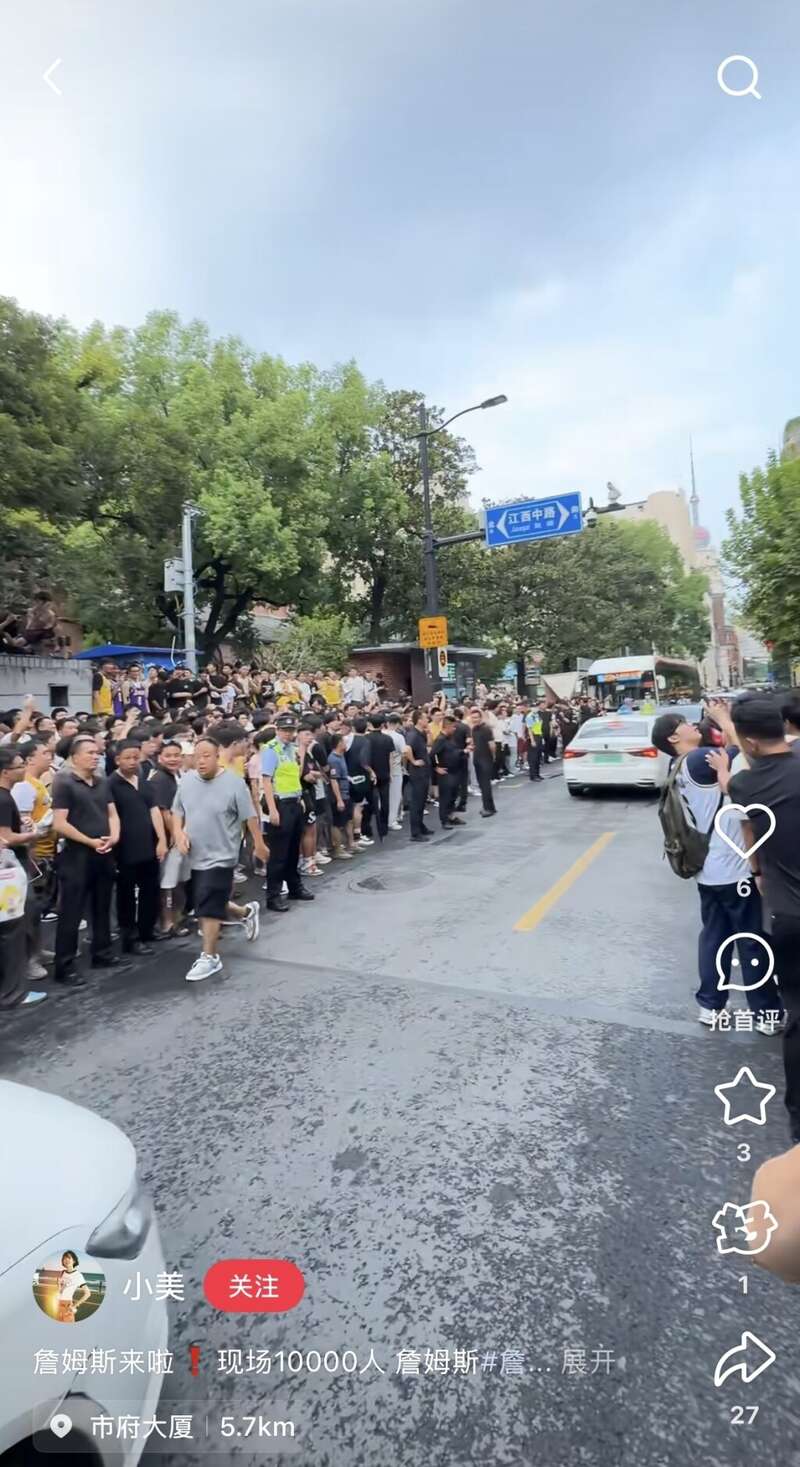 大批球迷聚集外滩等待詹姆斯。 社交平台 截图