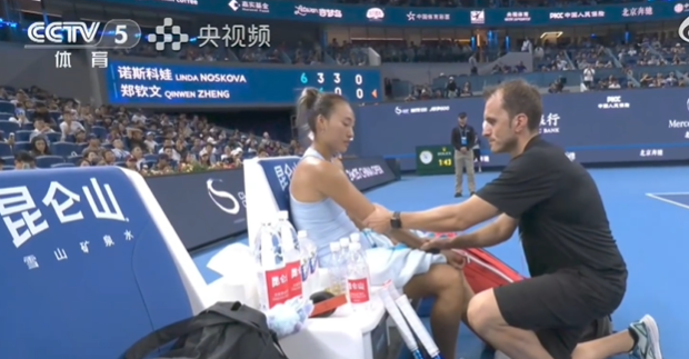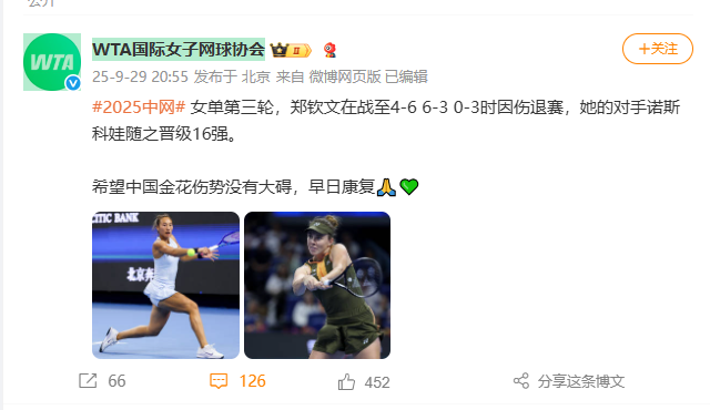 据央视体育,2025中网女单第三轮,郑钦文对阵诺斯科娃。第三盘0-3落后时,郑钦文因伤退赛,无缘16强。