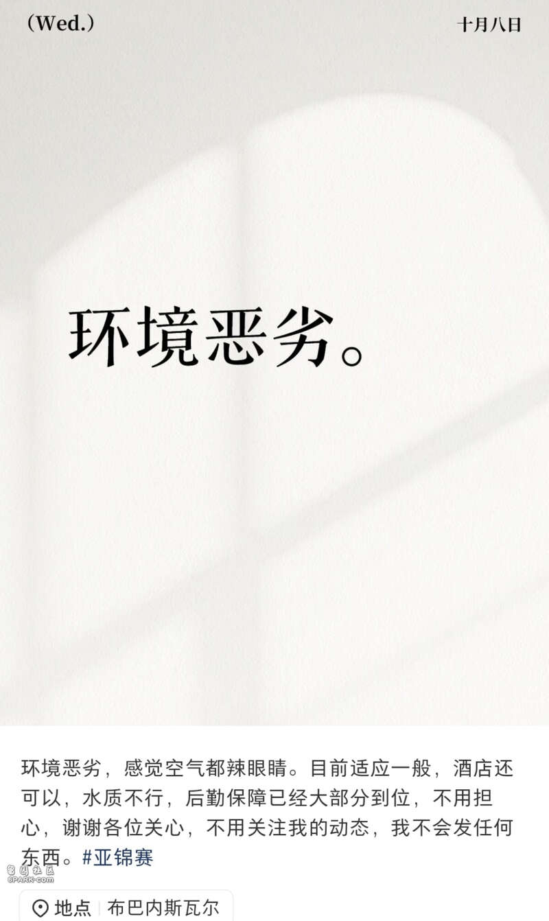 此外,中国乒乓球队的一名后勤保障人员发文称“环境恶劣”,国乒的后勤保障已经大部分到位,但“感觉空气都辣眼睛。目前适应一般,酒店还可以,水质不行。”