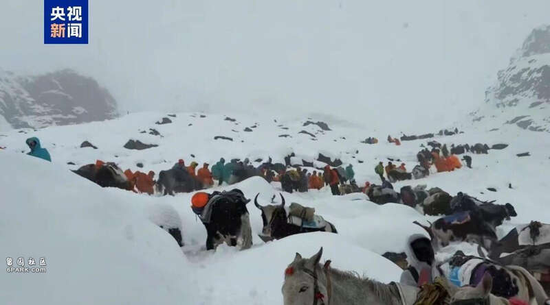 10月4日,位于西藏日喀则市定日县境内的珠峰东坡营地突降暴雪,整条线路受困人员或达上千人,营地帐篷被积雪全包裹甚至压塌,部分区域因降雪量过大导致帐篷被掩埋,牦牛因积雪过深无法行动。