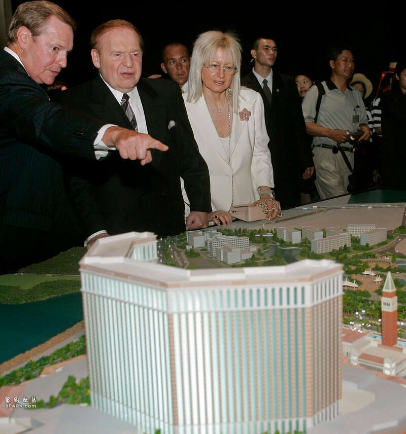 2006年,谢尔顿·阿德尔森(中)与妻子查看澳门威尼斯人场馆模型。NBA重返中国的赛事在该赌场的综艺馆举行。 Alex Hofford/European Pressphoto Agency