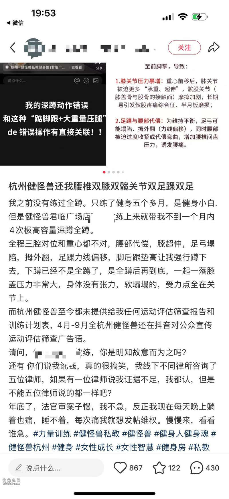 近日,一则“杭州健怪兽还我腰椎、双膝、双髋关节、双足踝、双足”的帖子引发关注。在该帖中,发帖人王女士(化姓)称自己是只练了五个多月的“小白”,此前没有练过全蹲,在私教教练张某的训练下,不到一个月进行了4次极高容量的深蹲全蹲,导致其身体多处损伤。