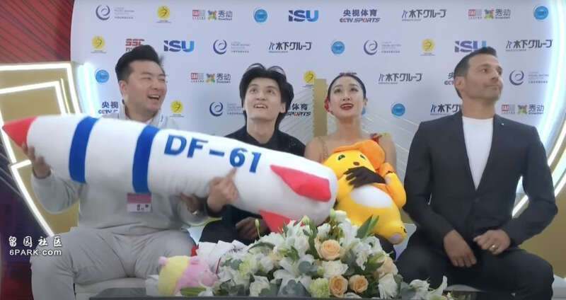 这一事件源于10月25日的花滑大奖赛中国杯冰舞比赛,中国选手任俊霏/邢珈宁在自由舞表演结束后,于等分区拿起了观众投掷的一个标有“DF-61”字样的毛绒玩偶。从赛事画面来看,邢珈宁与中国教练郑汛曾短暂摆弄并模拟飞行动作,随后由任俊霏抱在怀中等待分数。据悉,“DF-61”对应的是今年九三大阅兵中首次公开亮相的新型陆基洲际弹道导弹。