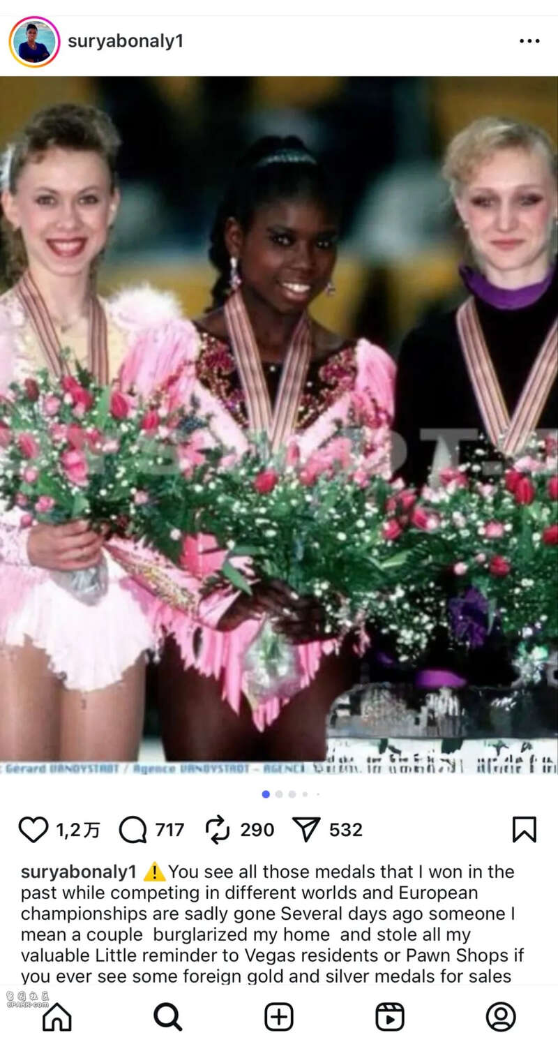 那位在世界赛场上翻腾跳跃、靠“落地一只脚后空翻”震碎全场的传奇花样滑冰运动员,Surya Bonaly,自己在Instagram上发了一条消息。不是日常分享,不是运动窍门,而是——她所有的奖牌,被偷光了。
