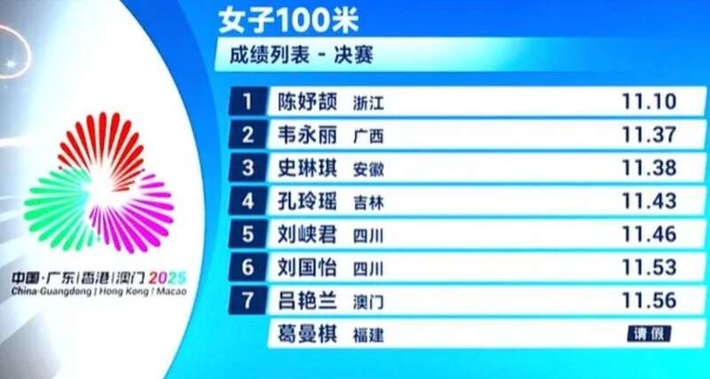 北京时间11月17日,全运会女子100米短跑决赛上演。最终,年仅16岁的小将陈妤颉爆冷夺冠,她的成绩为11秒10。老将韦永丽拿到第2名,而北大学霸刘峡君则排名第5。