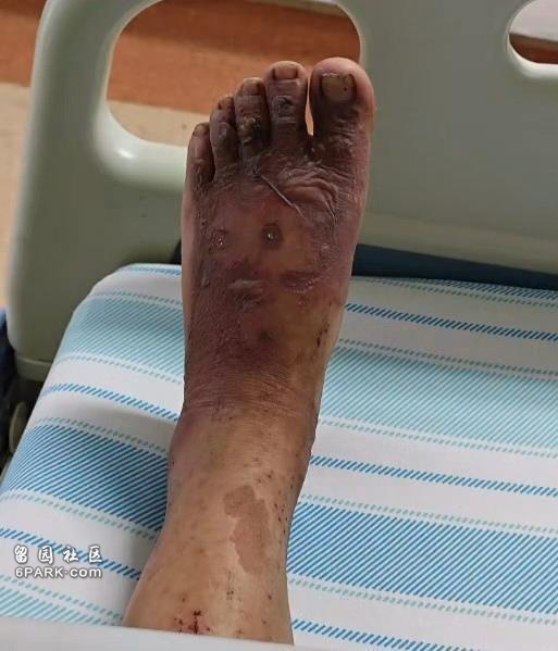 杨芳比赛时被烫伤的左脚(视频截图)