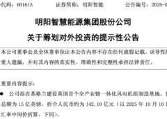 10月12日,中国风机制造商明阳智能发布公告称,公司拟在苏格兰建设英国首个全产业链一体化风电机组制造基地,预计投资总额为15亿英镑,折合人民币约为142.10亿元(以2025年10…