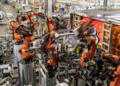 合肥一条汽车装配线上工作的机器人。中国的机器人公司与电动汽车和人工智能行业的企业一样,都已从国家层面的推动中受益。 Qilai Shen for The New York Time…