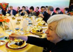 资料照:时任美联储主席的耶伦在北京钓鱼台国宾馆的工作午餐桌上。(2014年7月9日) 美国财政部官员星期天(11月13日)表示,美国财政部长耶伦周一将与中国的央行中国人民银行的行长…