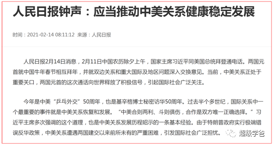 第一,2月11日,也就是我们的大年三十,拜登打来电话拜年。我估计说的都是客套话,值得注意的是2月14日,《人民日报》却给中美关系敲响了钟声。